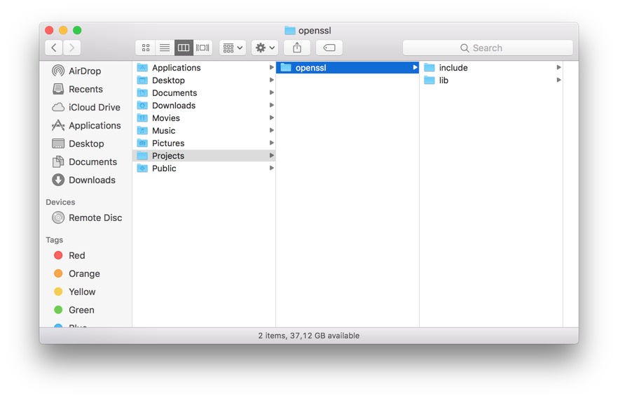 We assume that the pre-built package has been uncompressed in the /Users/Guest/Projects/openssl folder.